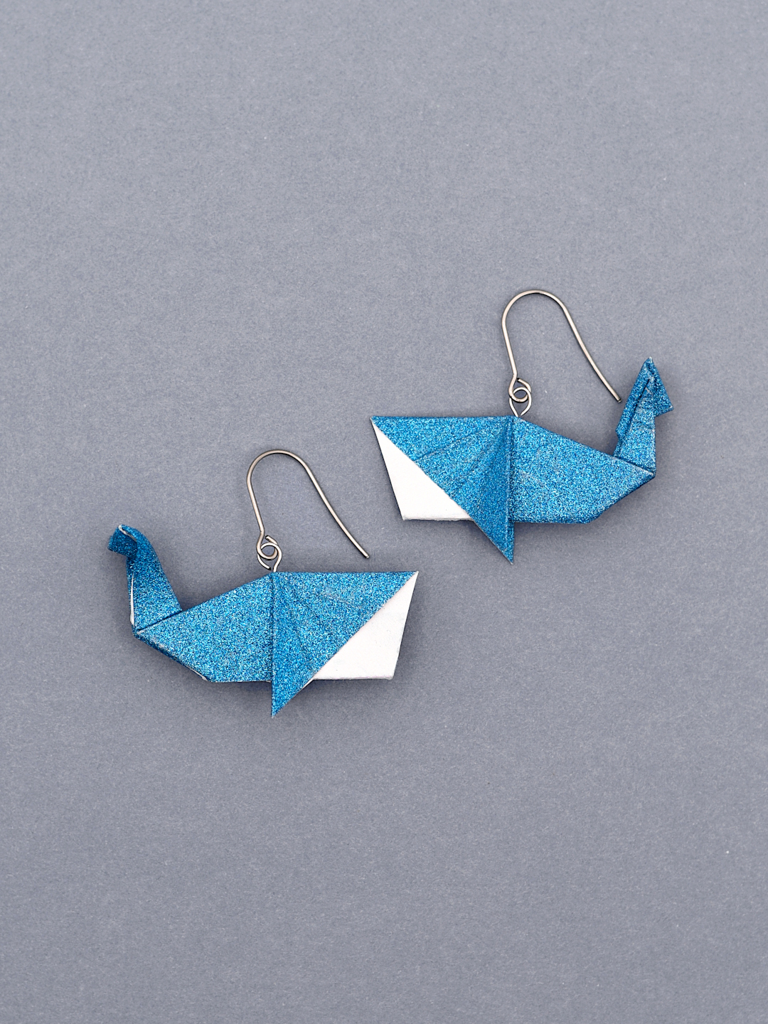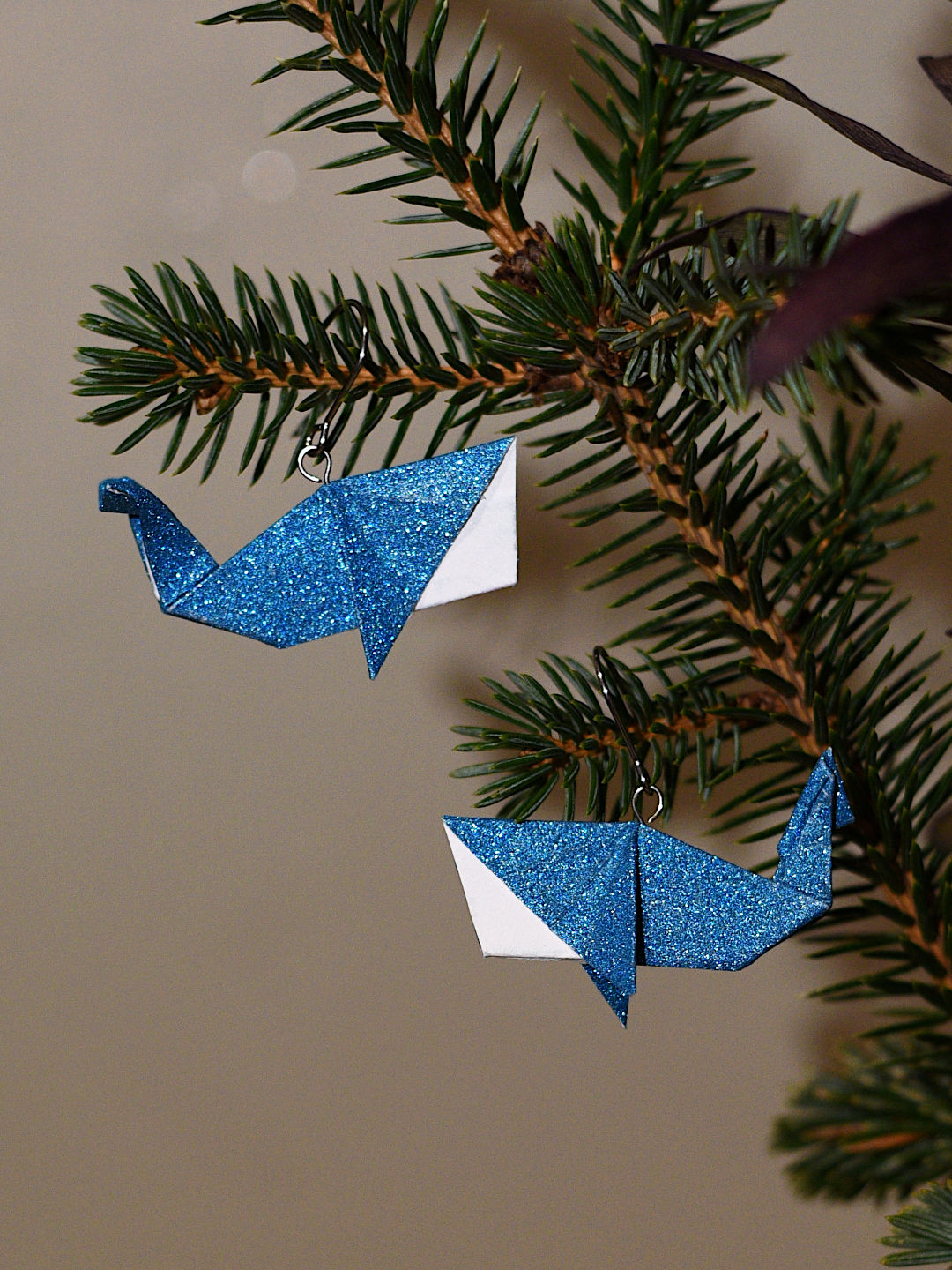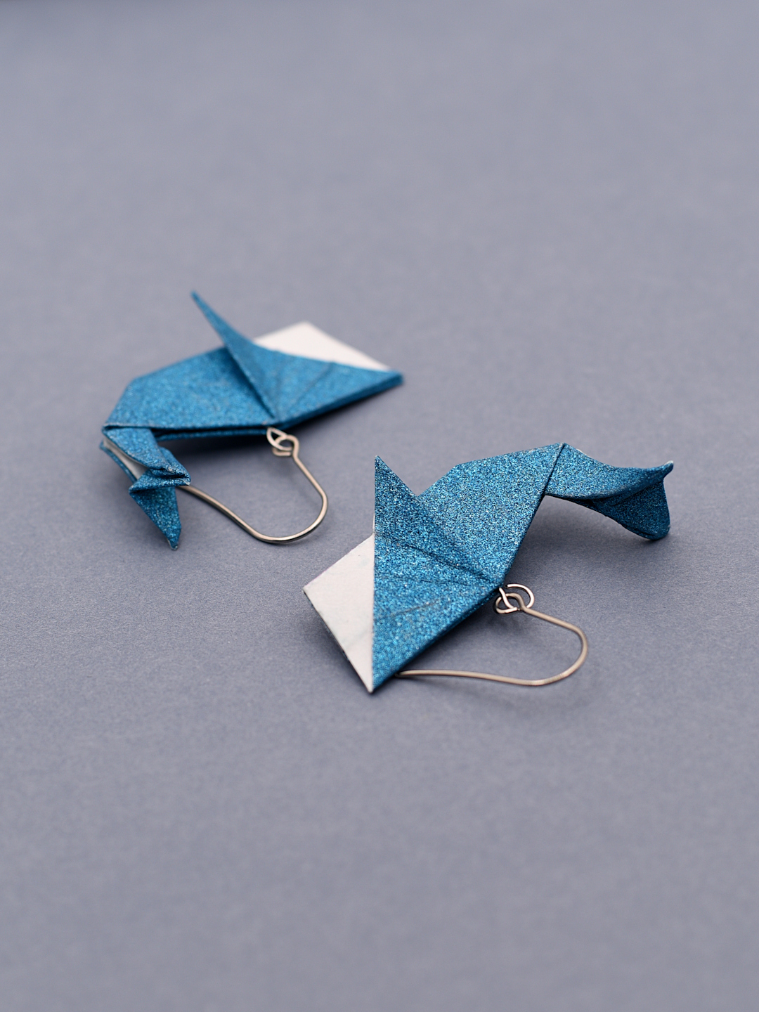 holiday special origami earrings – hand made from sparkling blue glitter paper, mounted on stainless steel hooks.